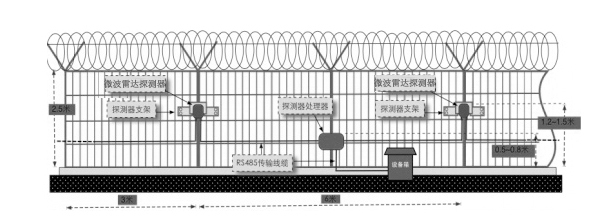 探測器采用壁掛方式布設(shè)在圍欄上,探測器之間通過RS-485總線相連,并匯聚到探測處理主機(jī)。此方案融合微波雷達(dá)和MEMS振動兩種入侵探測技術(shù),兼具主動和被動探測方式,具有預(yù)警距離遠(yuǎn),定位精度高,適應(yīng)性強(qiáng),易于安裝和調(diào)試等特點(diǎn),適用于民航、核電、物流、石油、電力、煙草、公安、司法等行業(yè)。